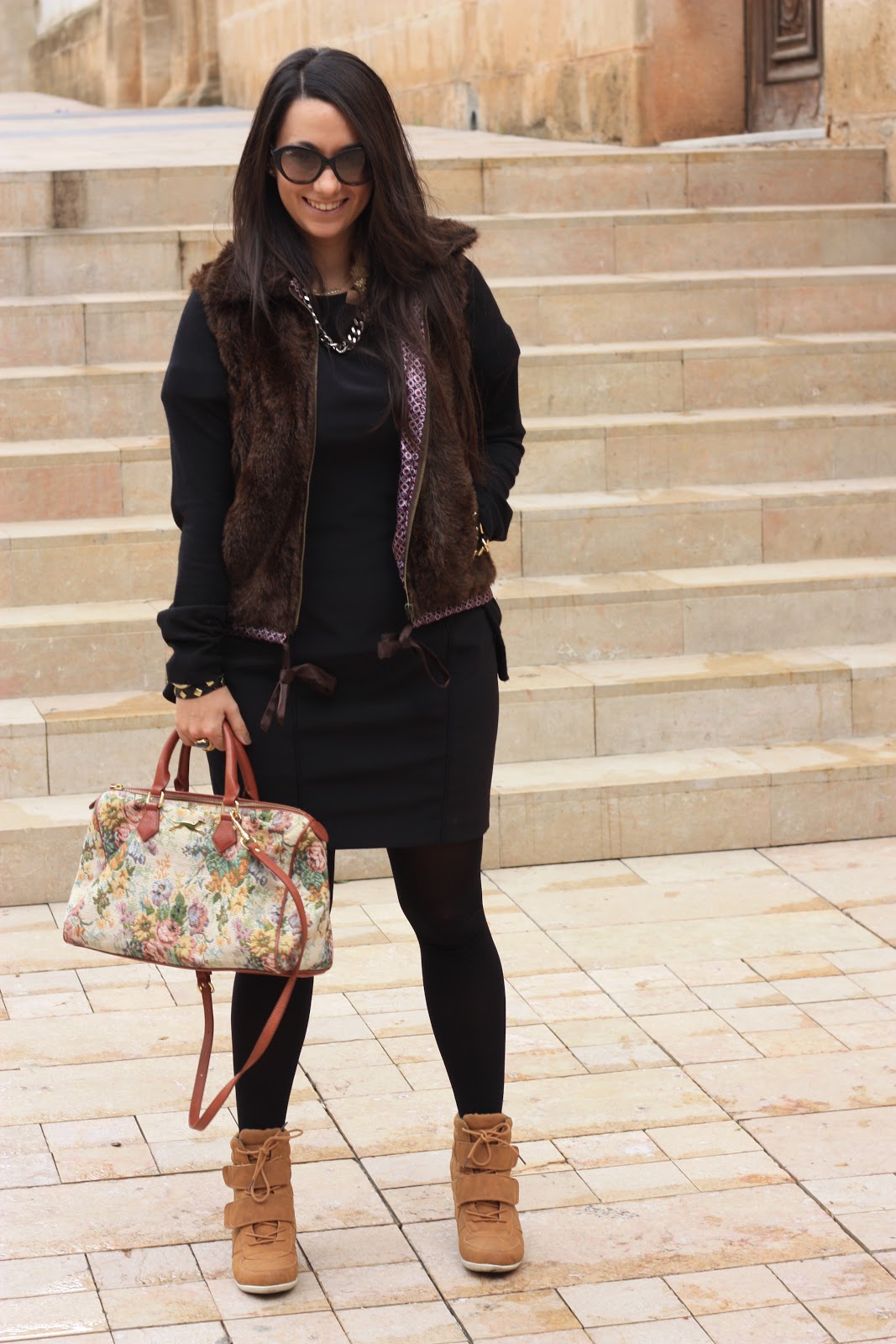 que el vestido era de manga corta) y un chaleco de pelo sintético color marrón